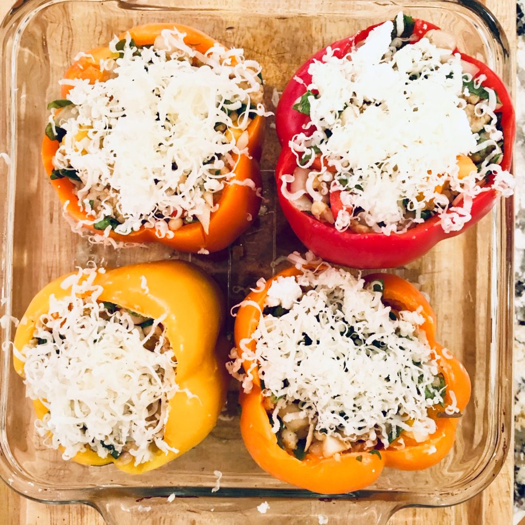 - Fill each bell pepper half-way with stuffing mixture, then add a sprinkle of goat cheese and then top with stuffing mixture. Pack down each pepper and top with goat cheese or favorite shredded cheese (you only really need a tablespoon or so each).