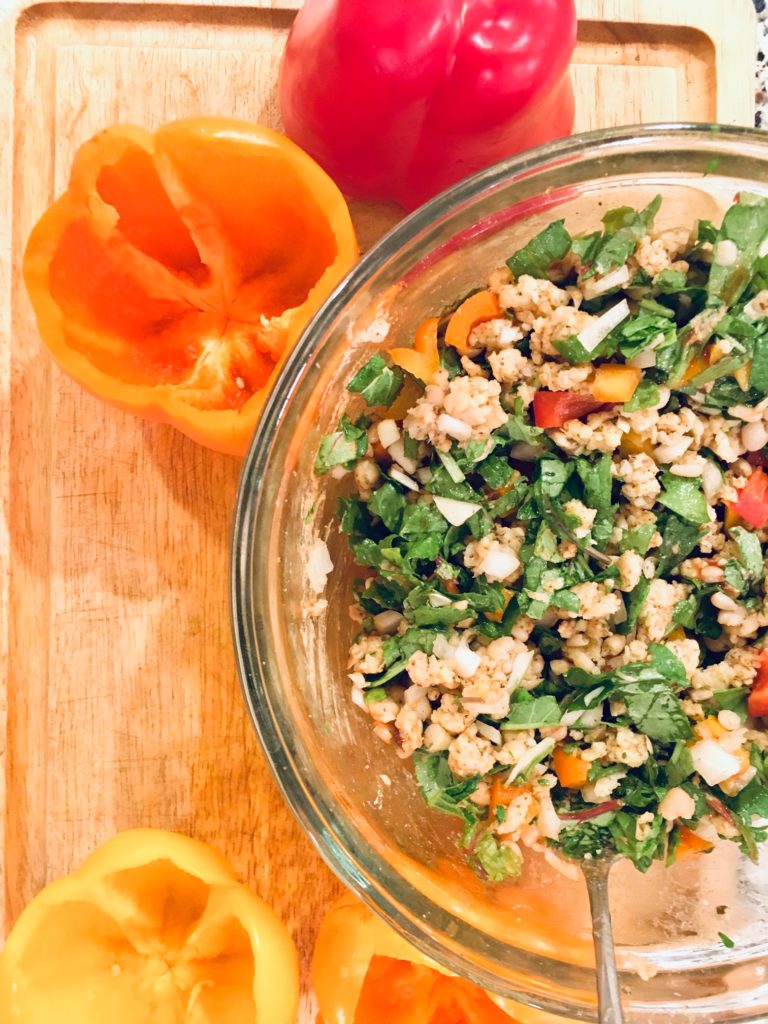 - Prep your bell peppers: wash and carve out the inside. Chop up any remaining bell pepper attached to the stem-top you removed, and add it to the stuffing mixture.