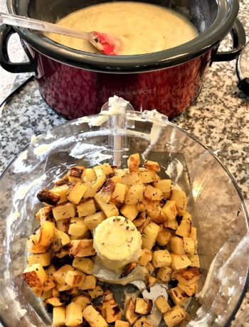 - In a large bowl or Corning ware, combine all of your ingredients, begin mixing. Stir in the goat cheese chunks until blended. Done!