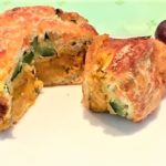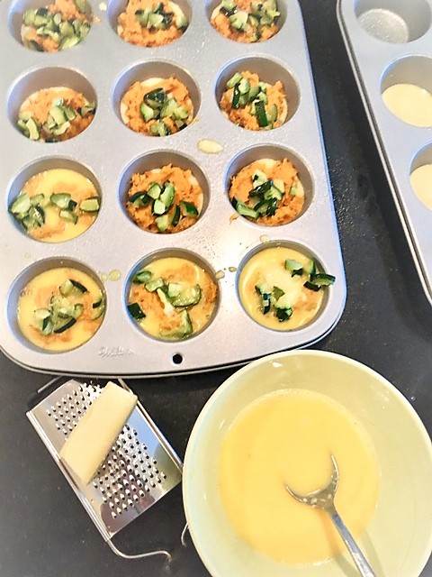 - Next, add sweet potato (or regular potatoes – whatever you have leftover) by the tablespoon – distribute evenly among muffins (or unevenly – you choose).