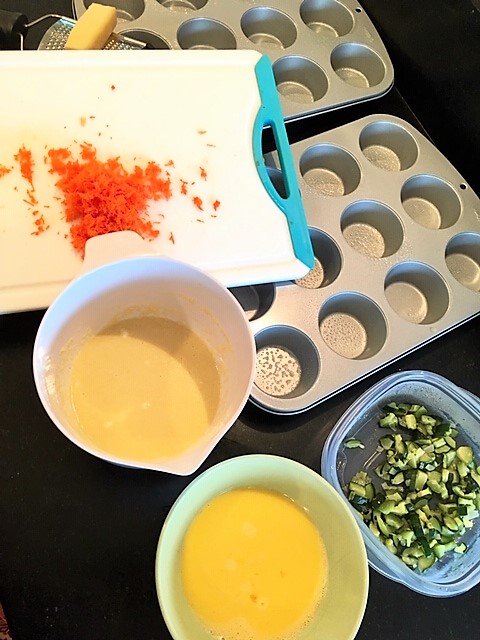 - Add the eggs – distribute these evenly among the muffins. If you run out – whisk another egg.