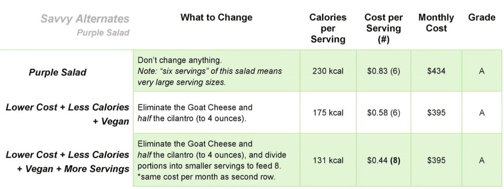 - Optional: Crumble goat cheese on top. This salad is really wonderful without the cheese and (surprisingly), a lower cost per calorie without it!