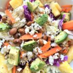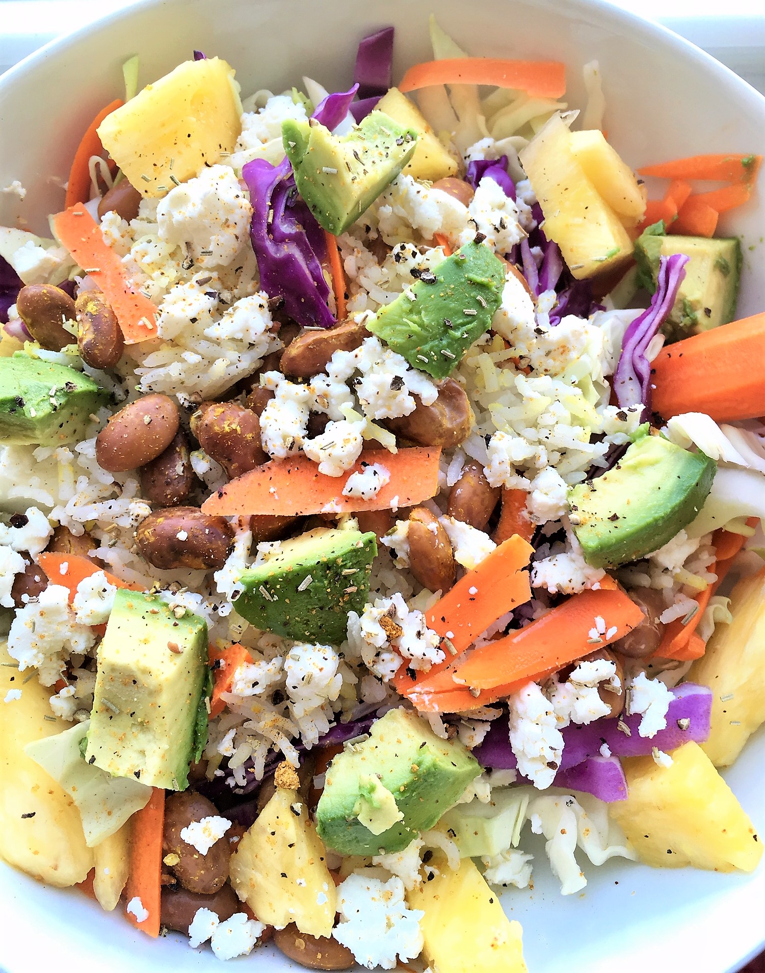 - Layer bottom to top as follows: Cabbage, peeled carrot, rice, beans, kalamata olives, pineapple, avocado, goat cheese.