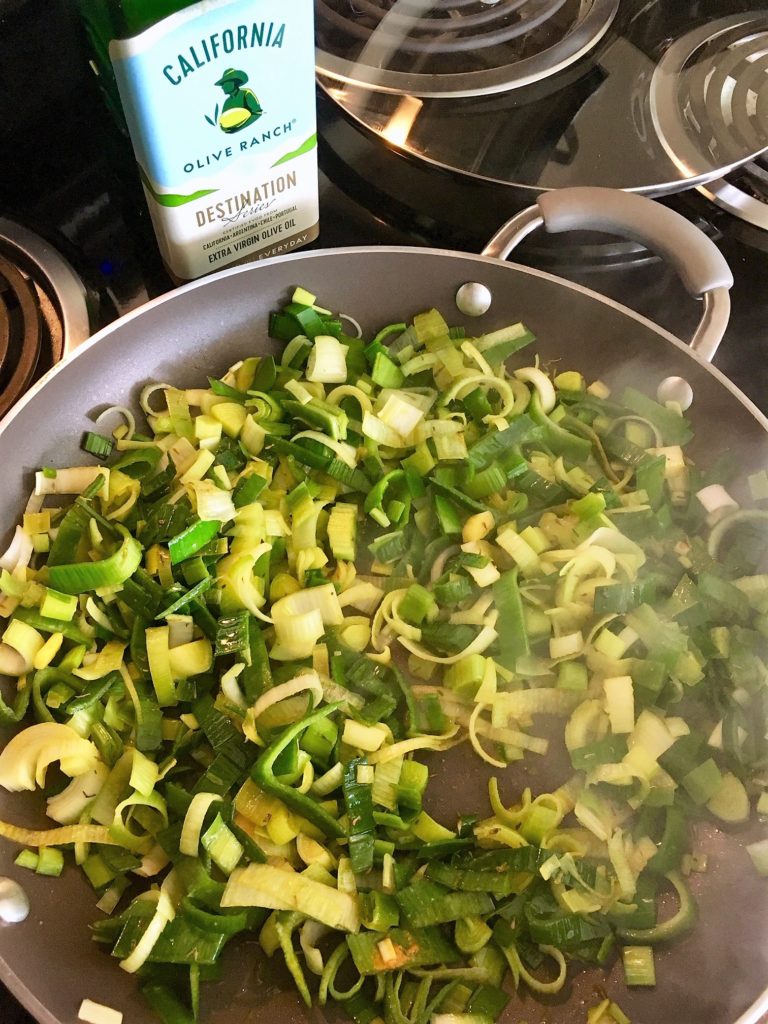 • Batch cook or use two skillets to cook your leeks. Add 1 tbsp olive oil and saute over medium heat for about 4-5 minutes, stirring frequently, until done.